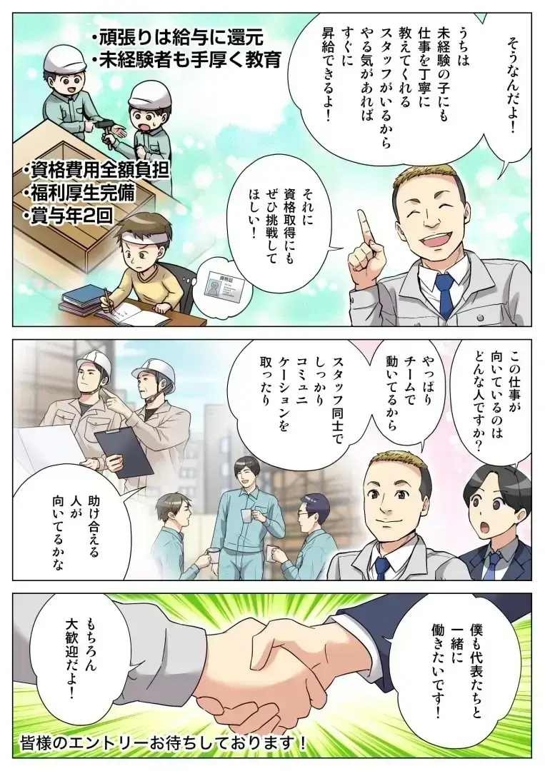 経験や学歴は問いません。資格も不要です。先輩従業員がしっかりと指導いたしますので、安心して飛び込んできてください。少しずつスキルを磨き、一人前を目指していきましょう。